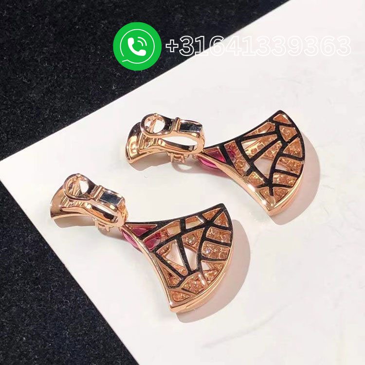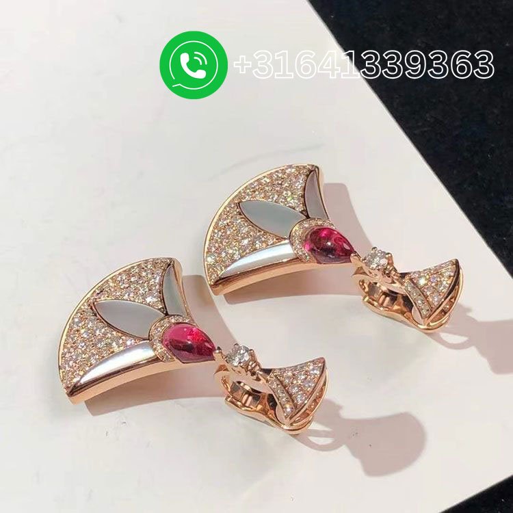 A refined expression of joyful femininity, the DIVAS’ DREAM 18 kt rose gold earrings offer an elegant and colourful interpretation of the iconic fan-shaped motif. Deeply rooted in Bulgari’s Roman heritage, the aesthetic signature of the collection is embellished with pavé diamonds and mother-of-pearl inlays, artfully cut to fit the intricate design, while two pear-shaped rubellites top the gemstone mosaic. Evoking the image of a blooming flower, the creation is an ode to timeless beauty.