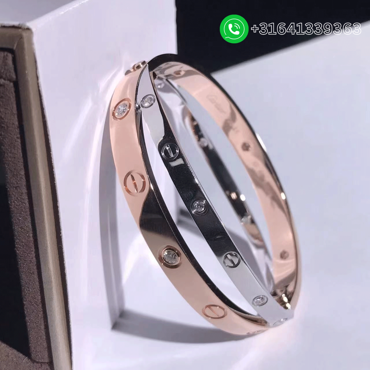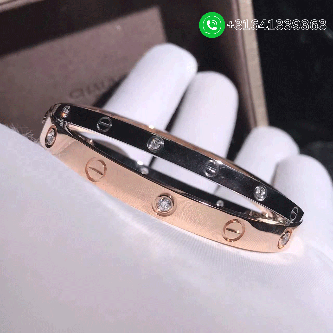 An 18k double rose and white gold diamond Love bangle by Cartier from the Love collection. The rose gold bangle is set with 6 round brilliant cut diamonds and alternating screw motifs, interlinking with it is a white gold band on either side also displaying the alternating diamond and screw motifs. Metal: 18k rose gold and white gold (Weight 49.94) Diamonds: 12 diamonds totaling 0.78ct Width: Rose Gold – 6.1mm; White Gold – 3.9mm Comes with a screwdriver Ref.: N6039117 Factory Wholesale Price: Please contact us via WhatsApp Whatsapp: +31641339363 ​ We offer 1:1 highest quality Cartier jewelry customized,and factory direct selling,only cost 30%~60% of the original cost of these popular brands. We have more than 15 years experience focus on luxury jewelry making,and all items are made in real 18K yellow gold,white gold,pink gold,platinum,gemstones and genuine diamond with GIA certificate. What’s more,all items are come with top workmanship,good service,factory price,original packages. ​​ We guarantee all of your products to be 100% authentic, and that what you see is absolutely what you get. Continuing to serve our customers and gain trust in our name is our mission. Our expert photographers take much time and care to capture the true beauty of the items we sell. What you see pictured is the actual item you will receive. Every detail possible can be seen in our pictures and we are proud of that, we here have nothing to hide. We want to show you every beautiful angle and edge of our inventory so you fall in love with the piece that’s just right for you.