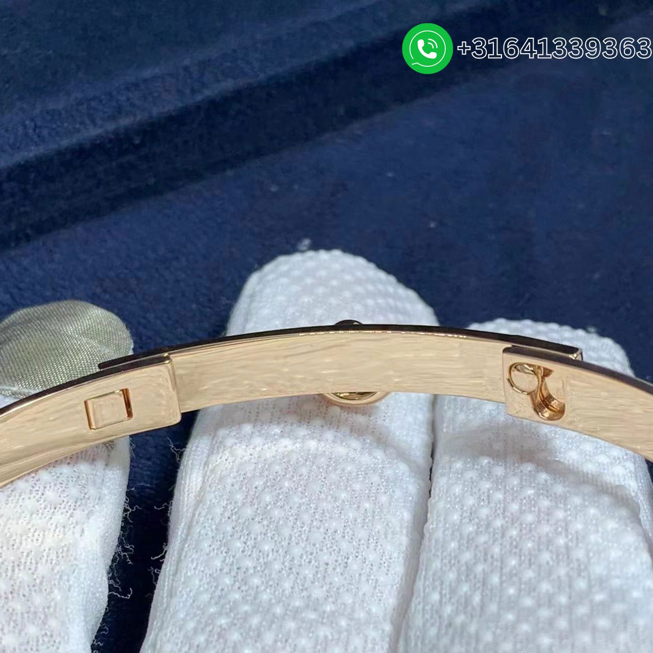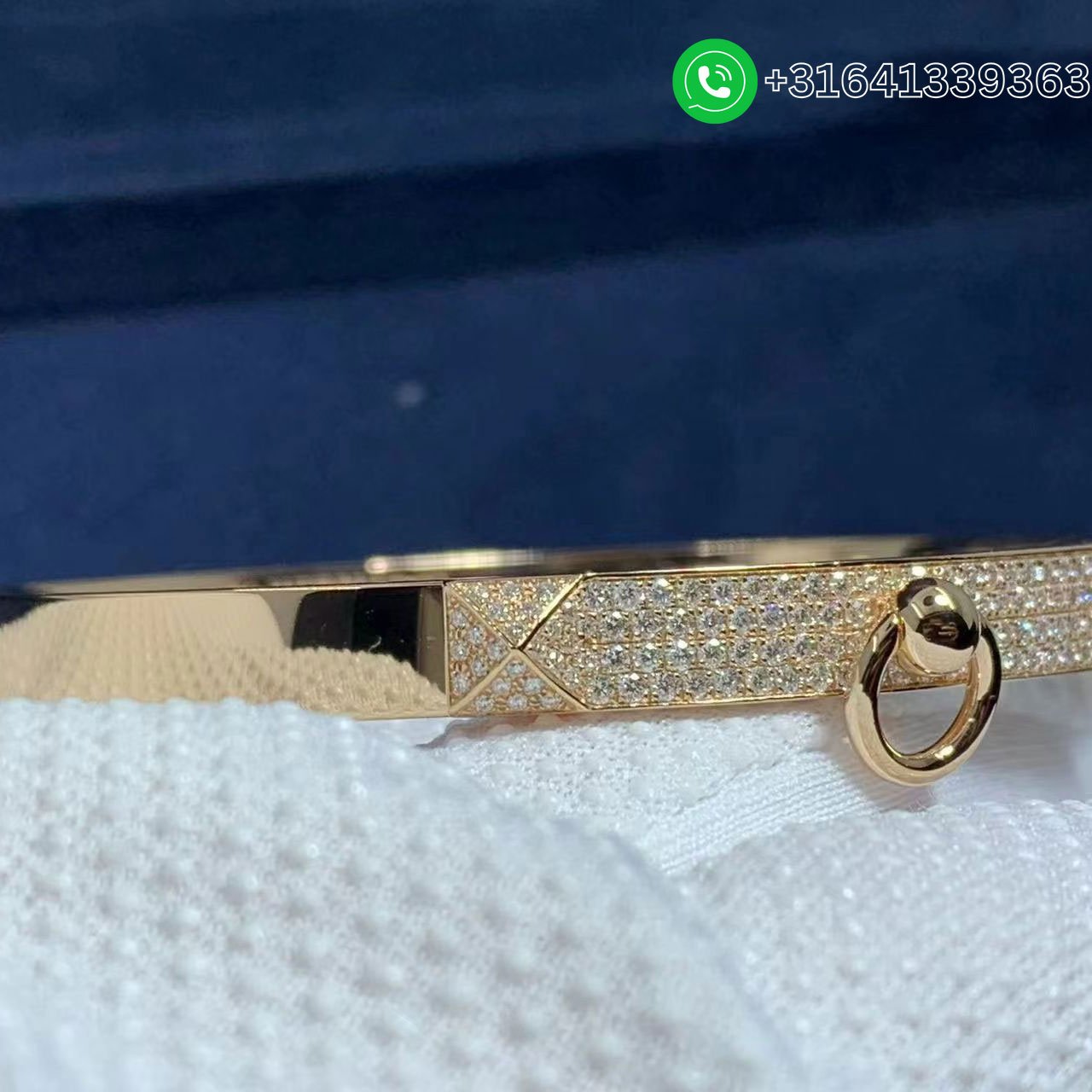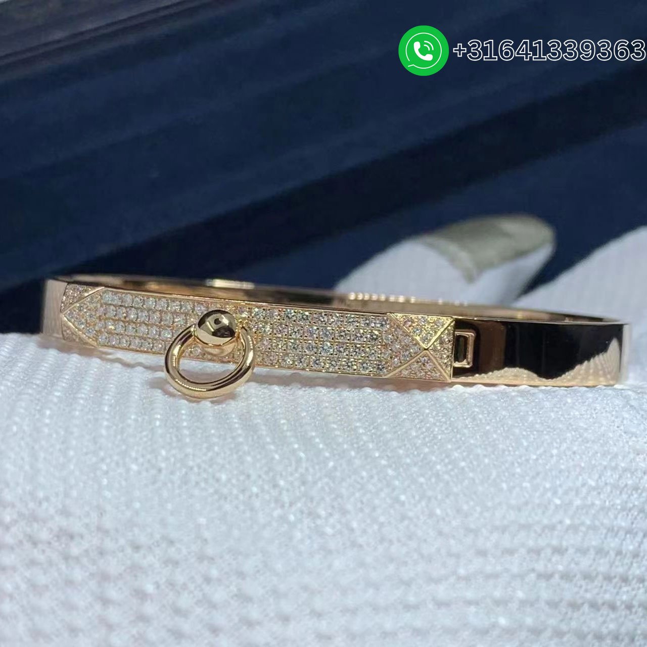 Rose gold diamond version of Hermes’s most popular bracelet – Collier de Chien. It is very similar to Cartier’s Love bangle. It has the signature studs and the ring on front of the bracelet, the bangle is in rose gold.
