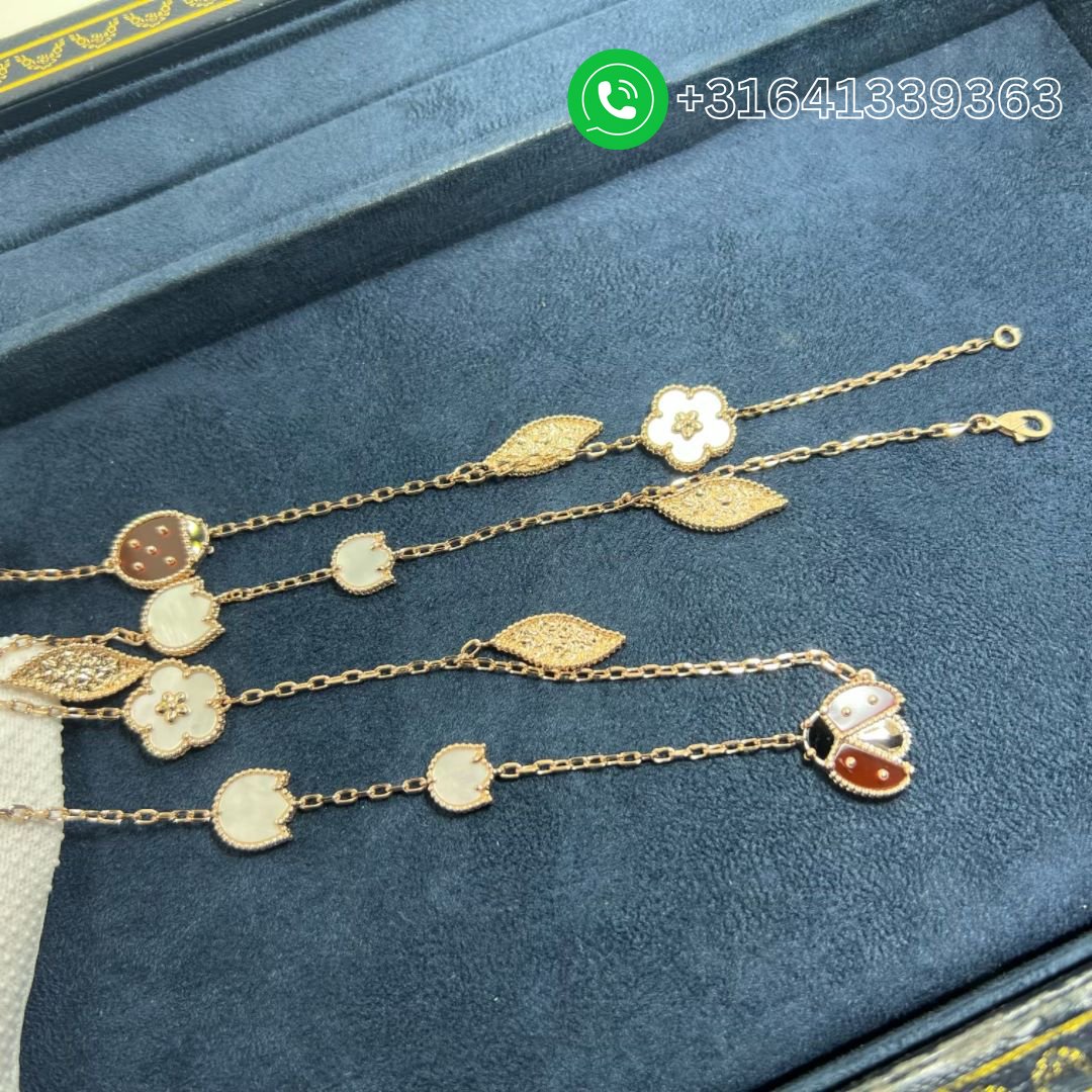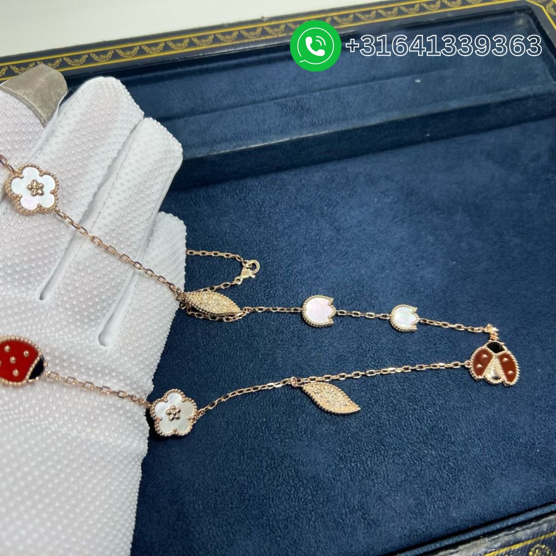 This is an authentic VAN CLEEF & ARPELS 18K Rose Gold Mother of Pearl Carnelian Onyx 15 Motifs Lucky Spring Long Necklace. The necklace is crafted of 18 karat rose gold and features an assortment of stations including white mother of pearl clovers, carnelian and black onyx ladybugs, and textured leaf charms. The necklace also features an invisible clasp hidden within a white mother of pearl clover.