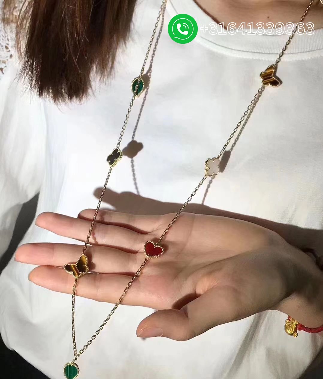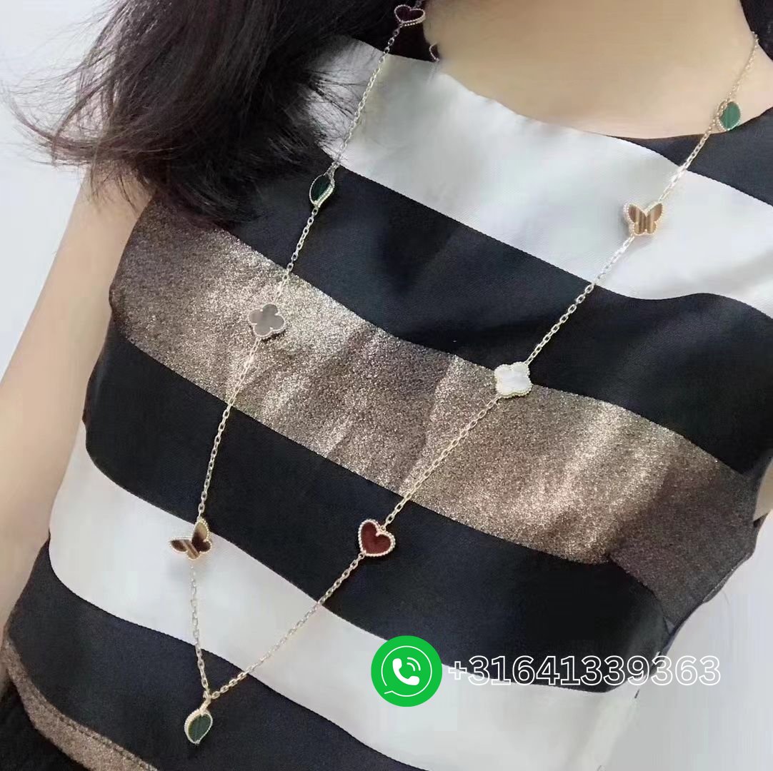 A beautiful Van Cleef & Arpels 18k Yellow Gold Gems 12 Motifs Lucky Alhambra Long Necklace. The necklace features 12 motifs, with a mixture of symbols such as hearts, butterflies, leaves and clovers. The motifs are set with carnelian, tiger’s eye, white & grey mother of pearl and malachite.